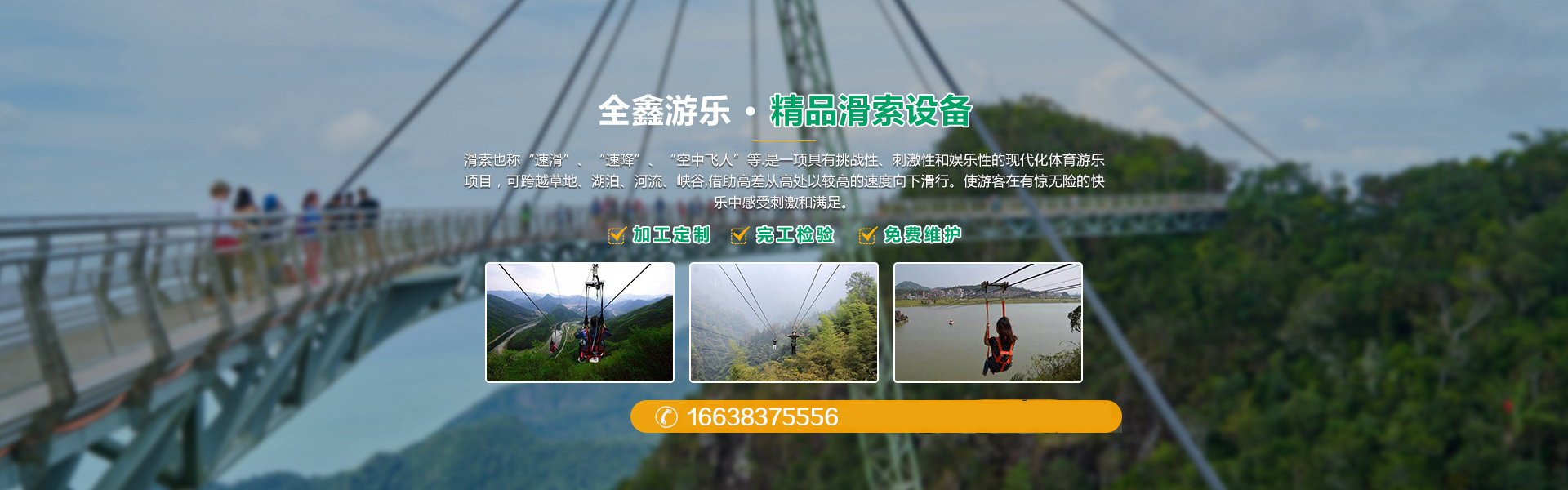 新鄉(xiāng)市全鑫游樂(lè)設(shè)備有限公司位于美麗的太行山邊新鄉(xiāng)市亢村工業(yè)園區(qū),該公司是以“研制、生產(chǎn)、安裝、銷(xiāo)售、售后服務(wù)”一體化的企業(yè),擁有一支愛(ài)廠(chǎng)敬業(yè)、專(zhuān)業(yè)的技術(shù)隊(duì)伍,足跡遍及全國(guó)各地的銷(xiāo)售精英,迅速快捷,服務(wù)周到的售后服務(wù)體系。公司主要經(jīng)營(yíng)滑索、玻璃吊橋、木板吊橋、滑道、滑草、趣橋、拓展訓(xùn)練、及所需鋼結(jié)構(gòu)的制造、安裝、設(shè)計(jì)、維修、銷(xiāo)售,另外為景區(qū)提供景觀(guān)設(shè)計(jì)、水壩包裝、滑漂線(xiàn)路勘察、設(shè)計(jì)等工程.技術(shù)力量雄......